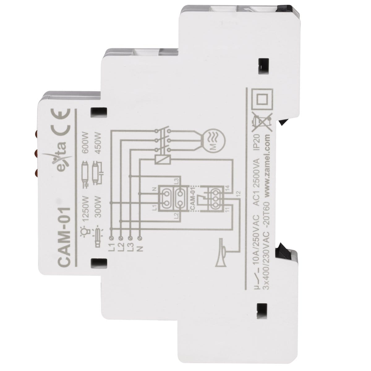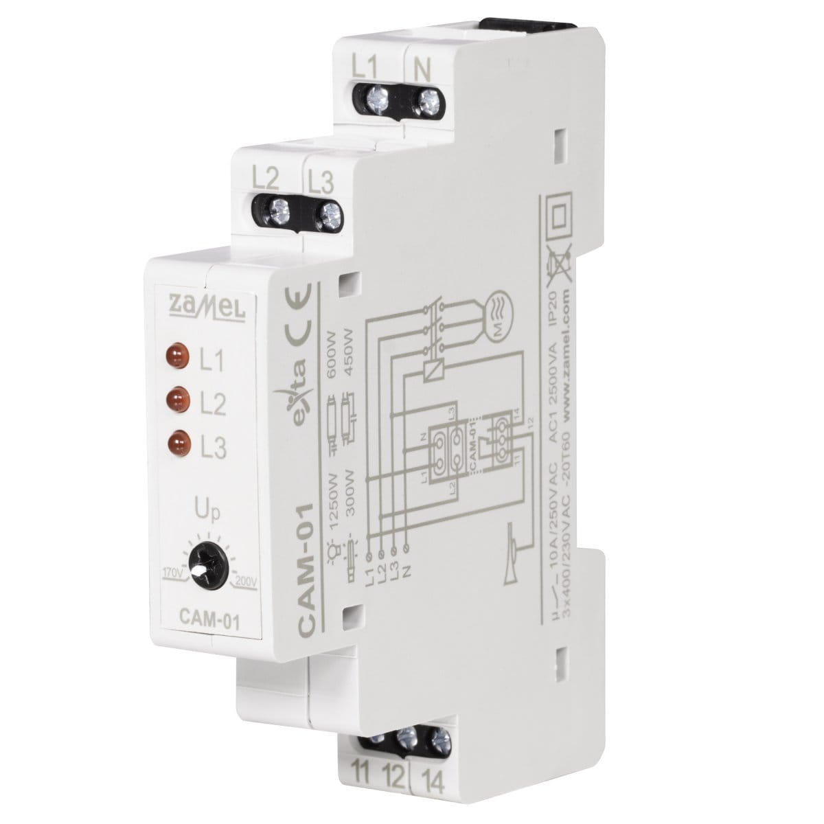 Czujnik asymetrii napięcia CAM01 służy do zabezpieczenia urządzeń zasilanych z sieci trójfazowej (np. silniki) przed uszkodzeniem, w przypadku zaniku napięcia fazowego lub asymetrią napięć fazowych. Wartość progowa napięcia zadziałania może być nastawiona przez użytkownika za pomocą potencjometru. Układ nie zabezpiecza przed symetrycznym spadkiem napięcia. Układ zasilany jest z fazy L1. Opóźnienie wyłączenia oraz histereza napięciowa powodują, że układ jest odporny na krótkotrwałe wahania napięcia.
