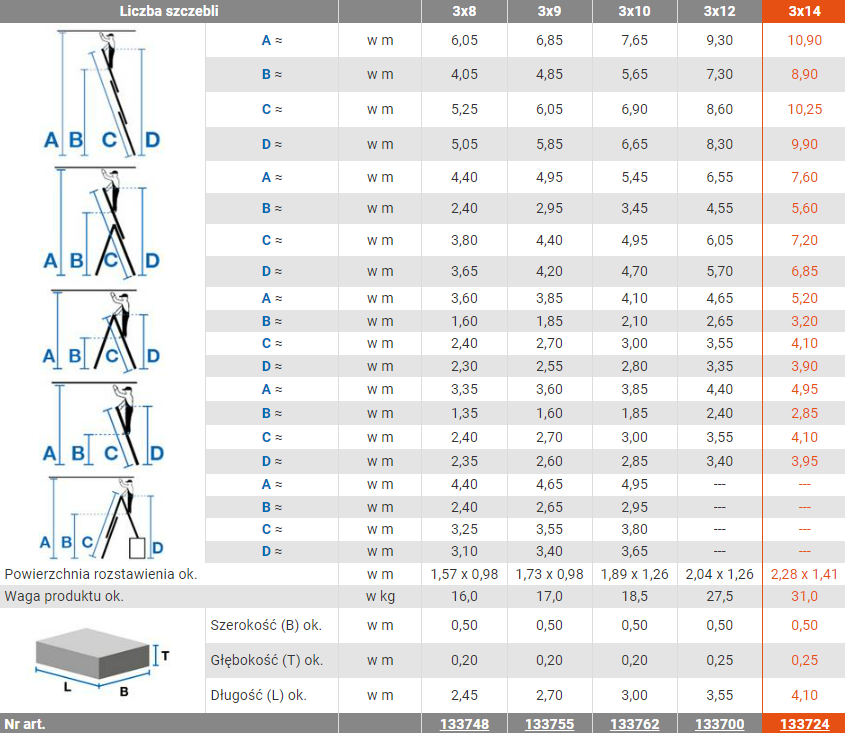 - W wersjach 3x12 i 3x14 szczebli, w komplecie znajdują się rolki przyścienne ułatwiające rozsuwanie drabiny.